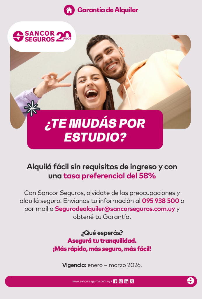 SANCOR SEGUROS: Garantía de Alquiler para estudiantesPor Eduardo / enero 16, 2026 NOTICIAS SANCOR SEGUROS: Garantía de Alquiler para estudiantes. Alquilá fácil sin requisitos de ingreso y con una tasa preferencial del 58%