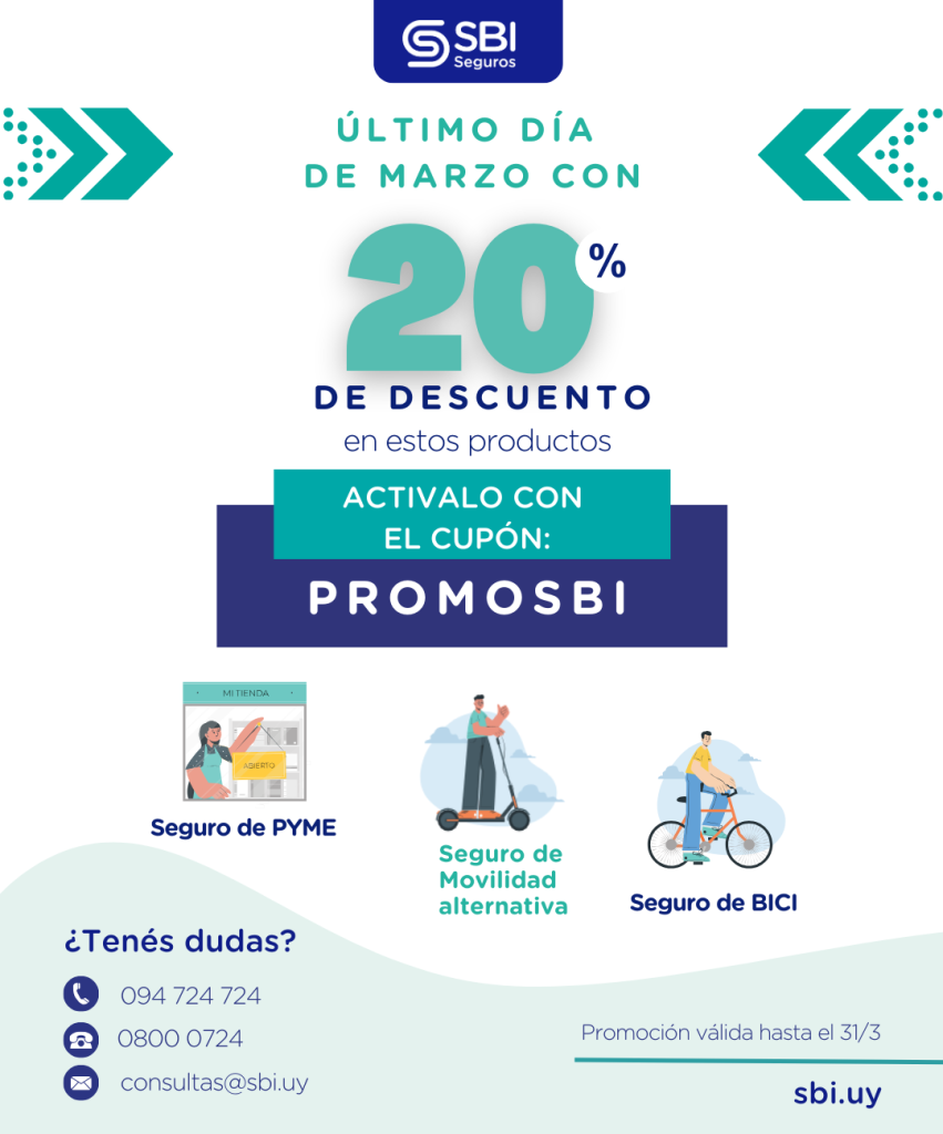 SBI – 📢 Último día PROMOSBI de marzoPor Eduardo / marzo 31, 2025 NOTICIA SBI – 📢 Último día PROMOSBI de marzo ULTIMO DIA DEL 20% DE DESCUENTO EN ESTOS PRODUCTOS: Seguro PYME Seguro de Movilidad alternativa Seguro de Bicicleta